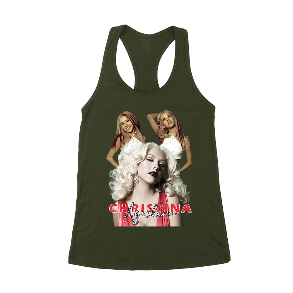 Sassy Christina Aguilera T-Shirt with Red Dress and Confident Expression Women’s Racerback Tank Top