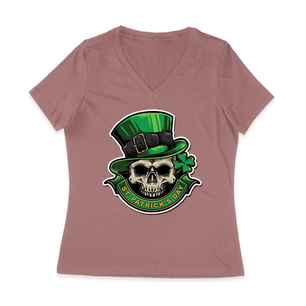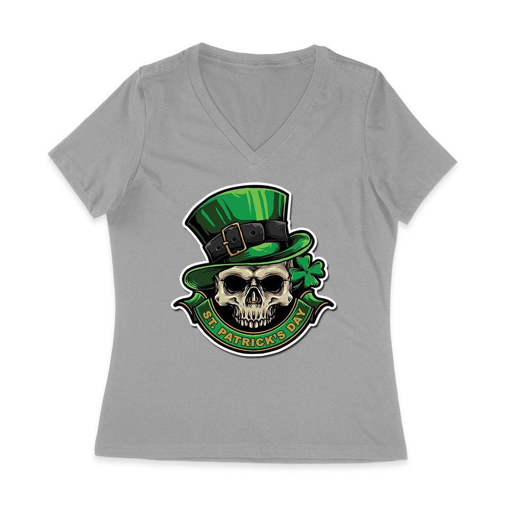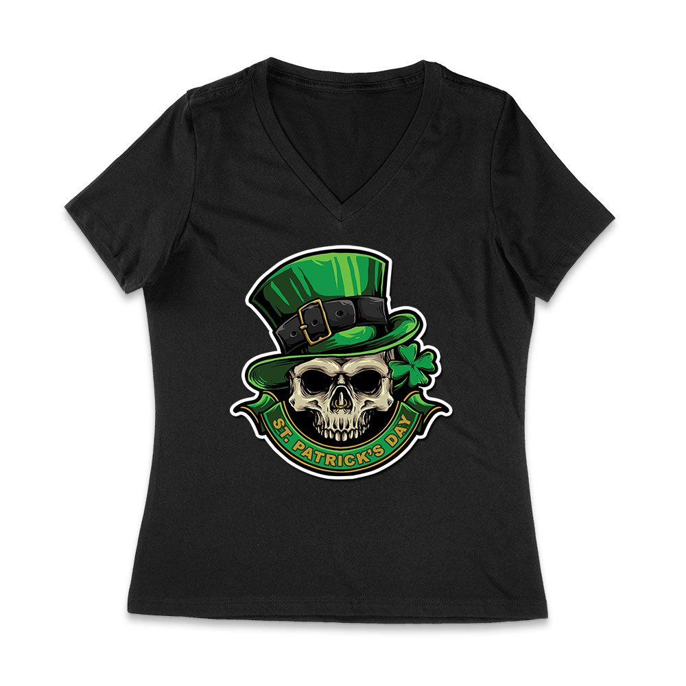 St. Patrick’s Day Skull T-Shirt – Cool Irish Shamrock Gothic Lucky Party Tee Women Jersey V-Neck