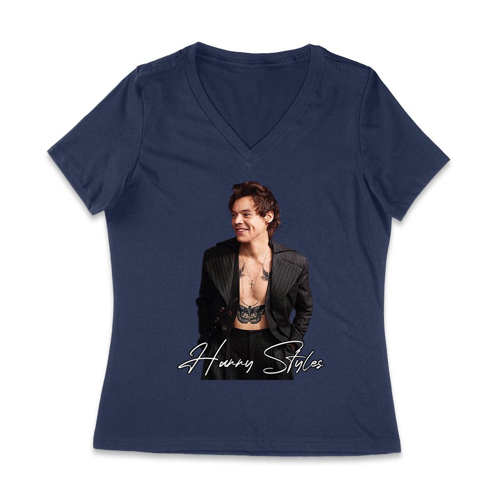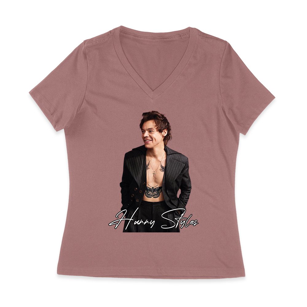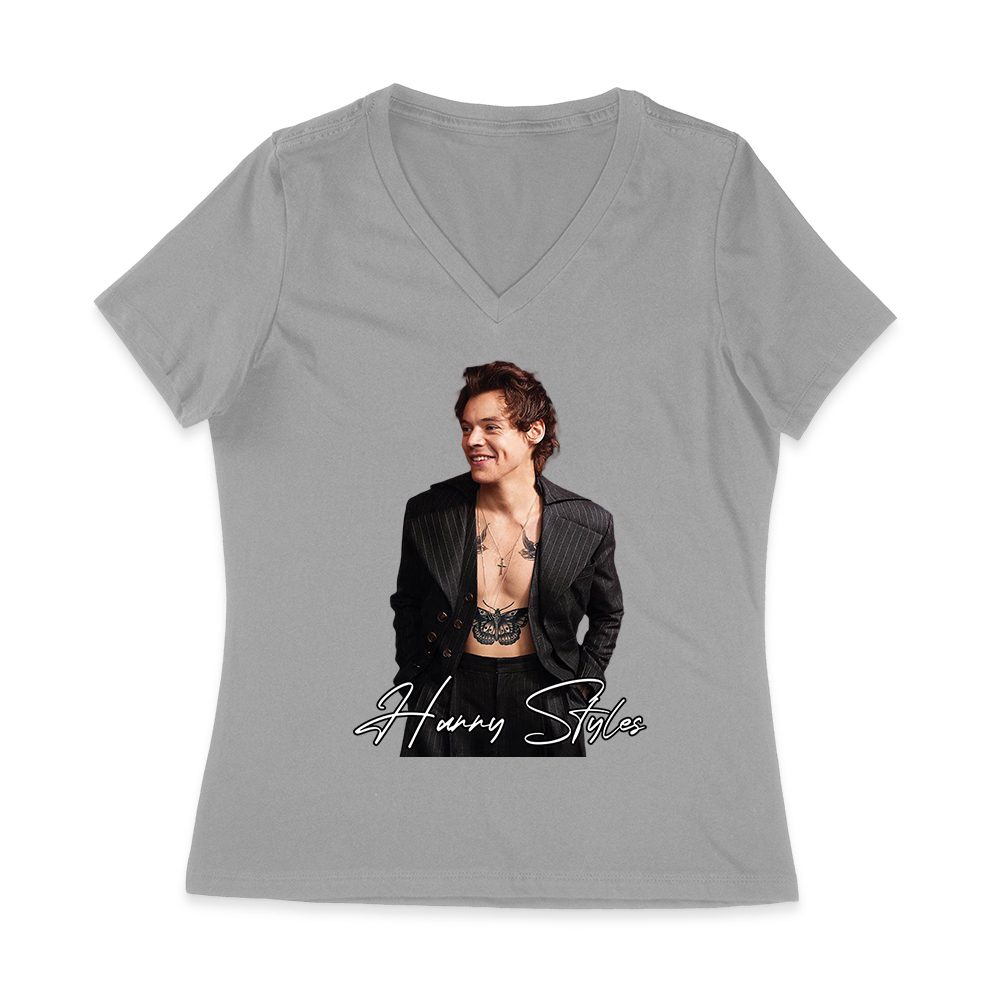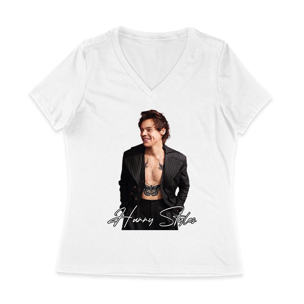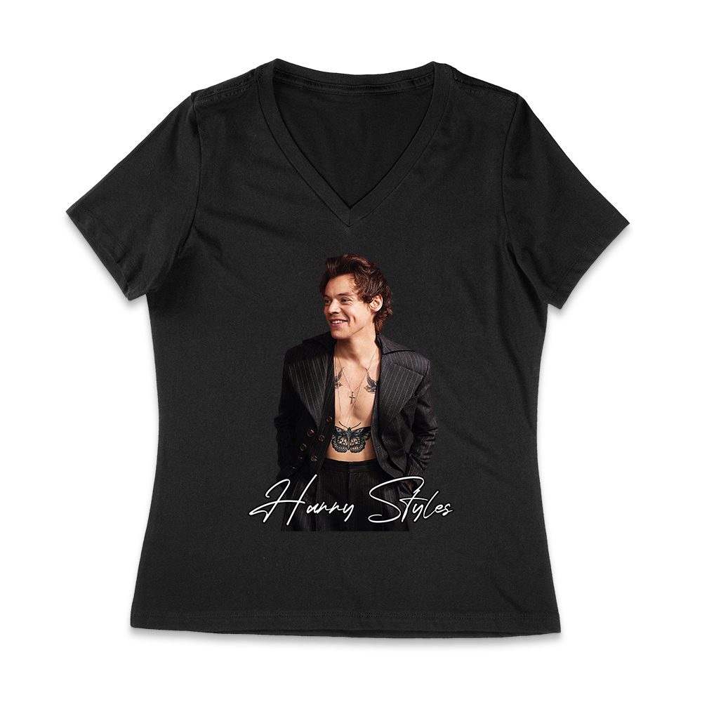 Stylish Black and White Hary-Styls Portrait Graphic Tee for True Fans Women Jersey V-Neck