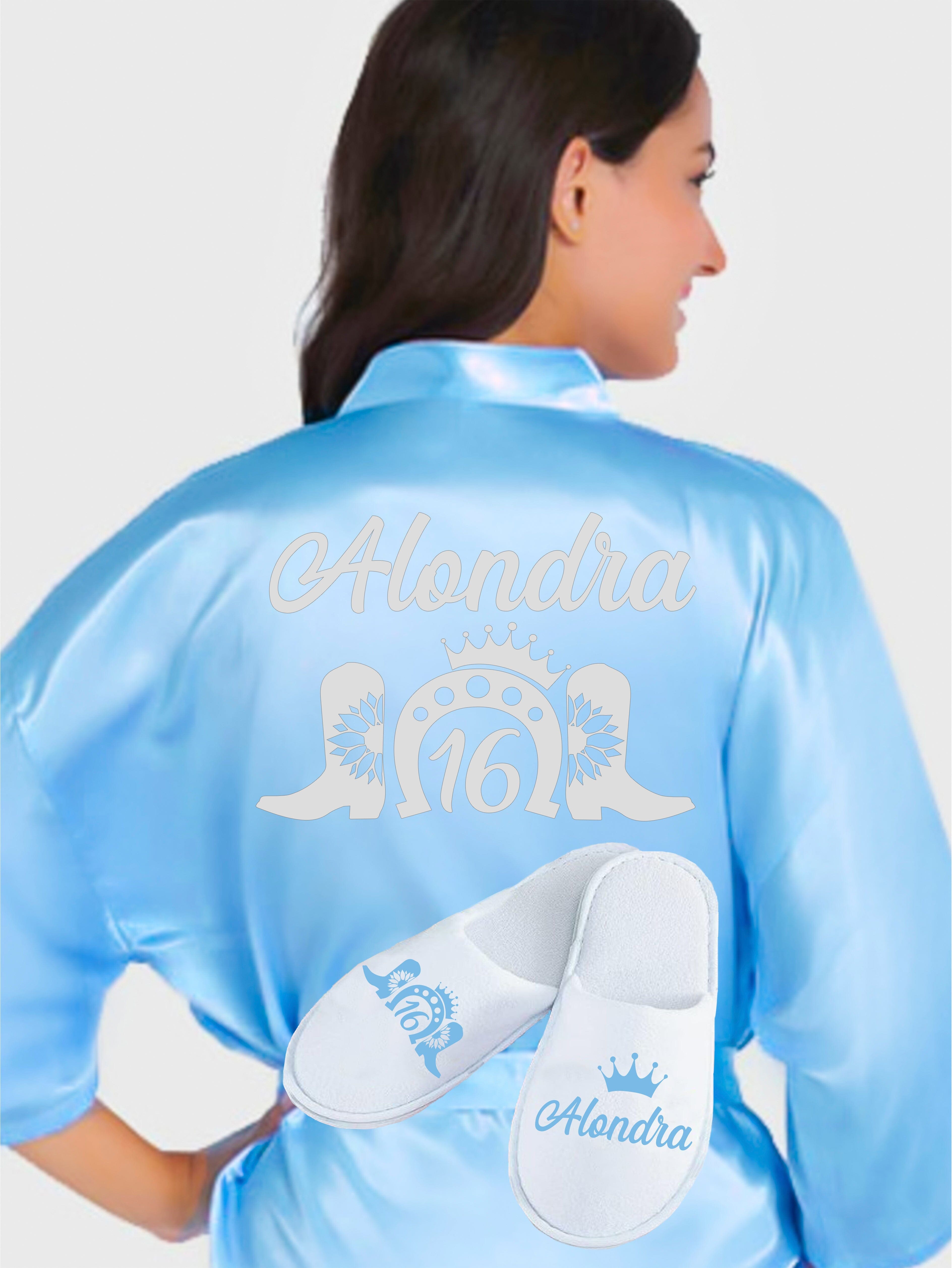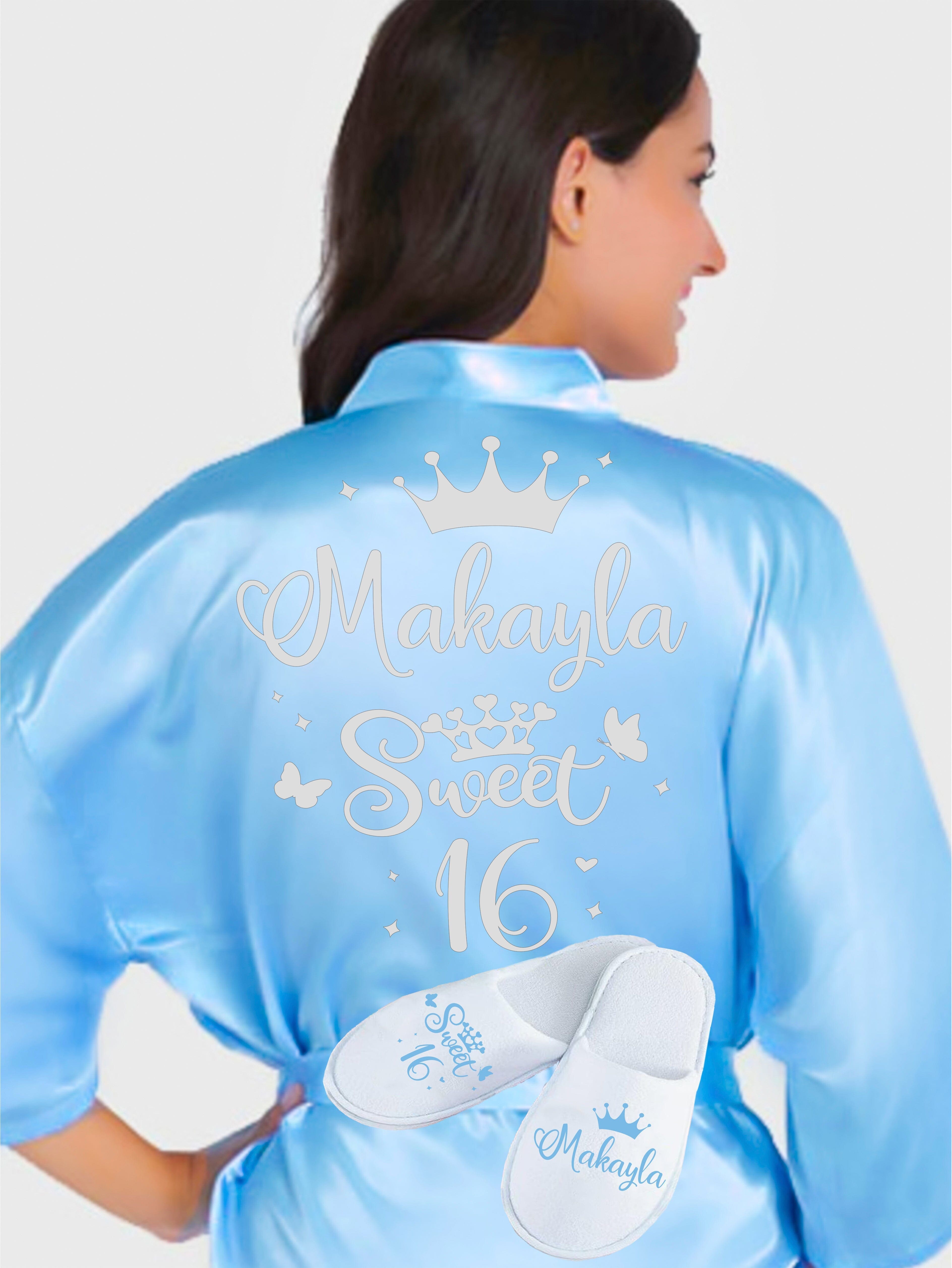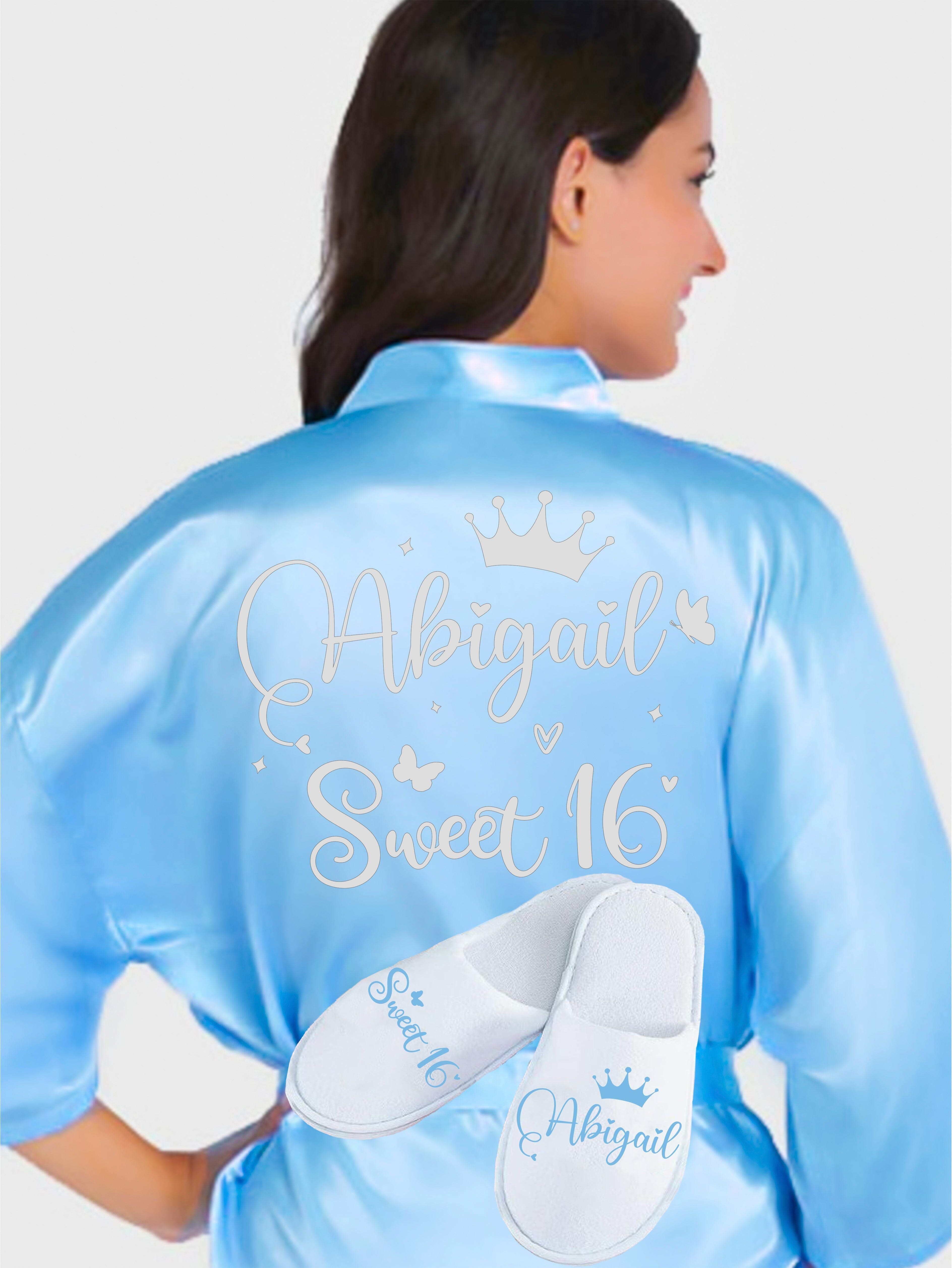 This elegant Sweet 16 robe set in Light Blue with Silver accents includes a beautifully designed robe and matching slippers, perfect for your special celebration. Every detail is personalized to make this set truly unique, adding a personal touch to your memorable day. Celebrate in style with this luxurious, customized ensemble!