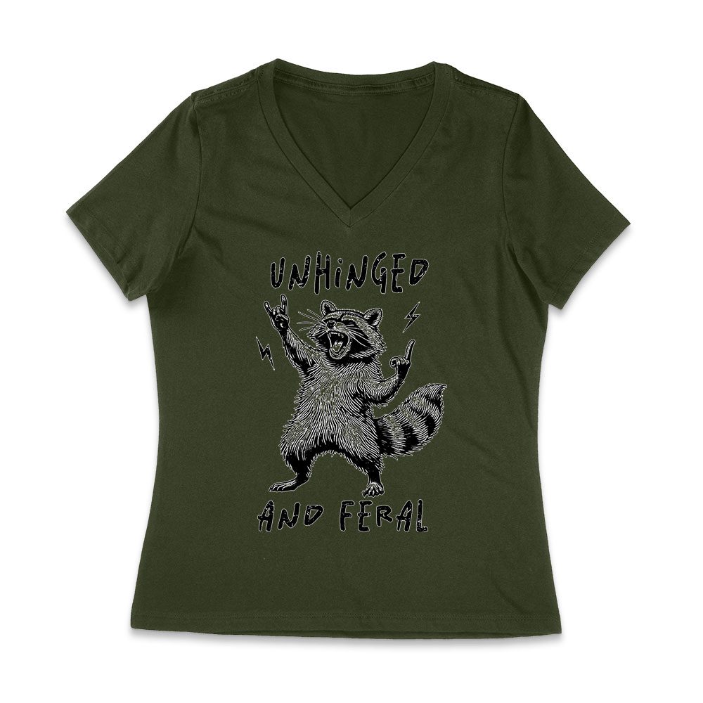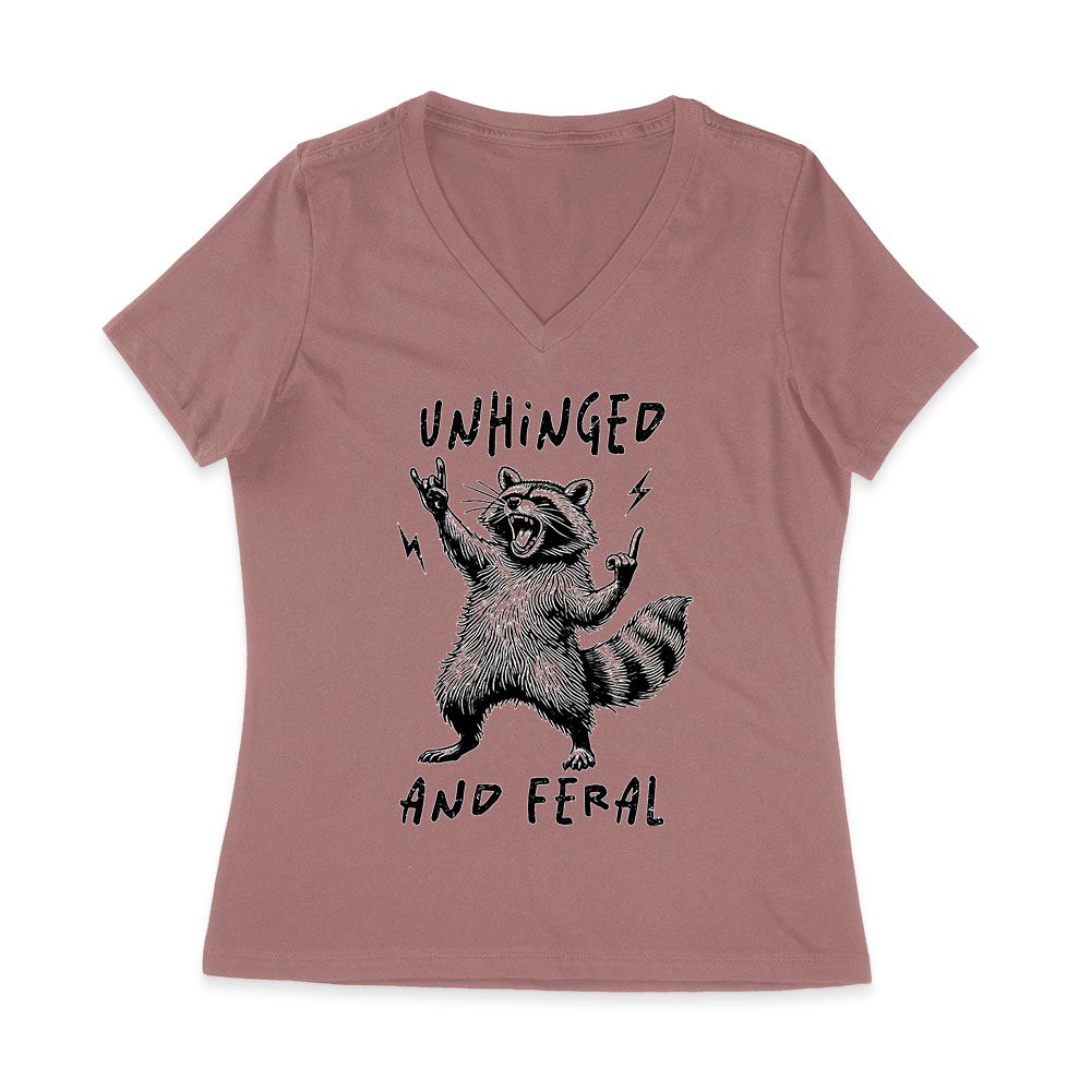 Unhinged and Feral Raccoon – Funny Mother’s Day T-Shirt – Wild Mom Gift – Edgy Animal Print Tee Women Jersey V-Neck