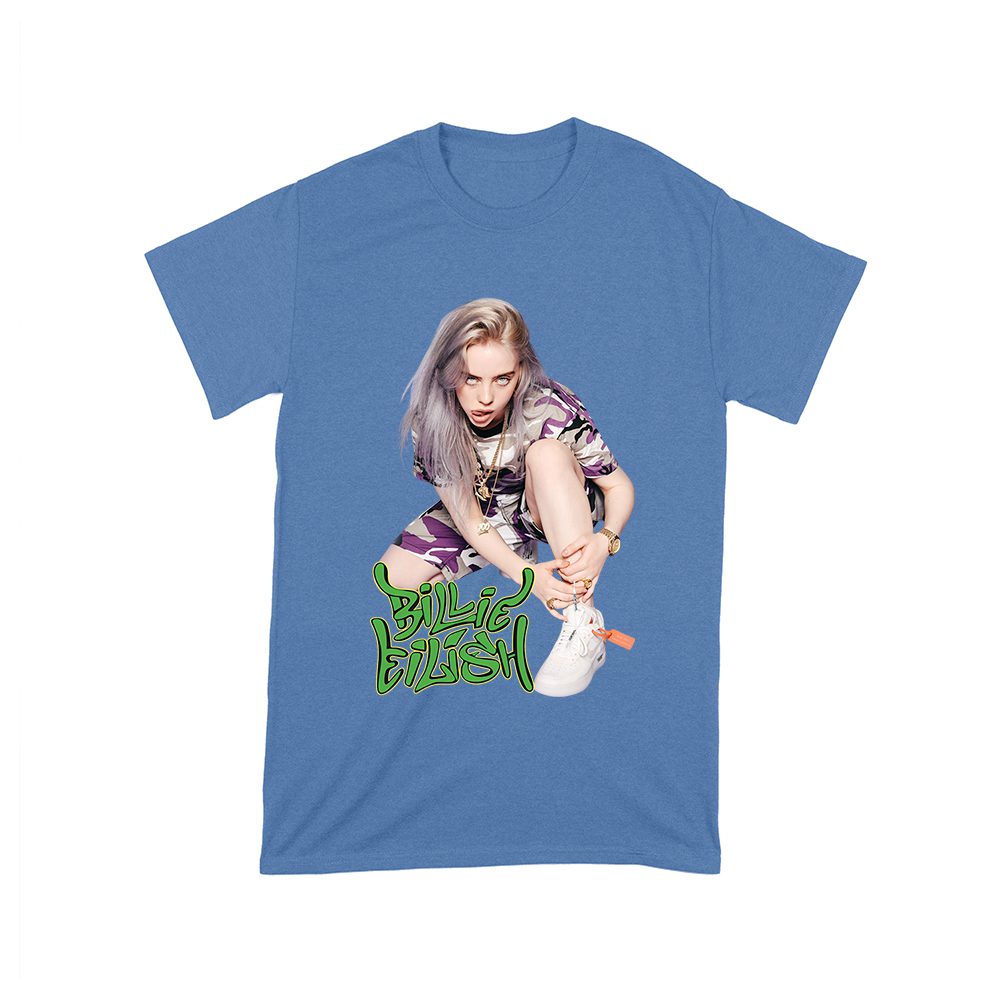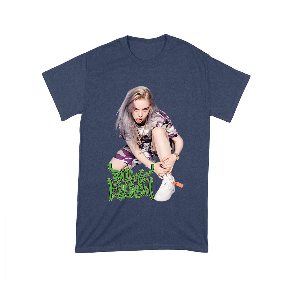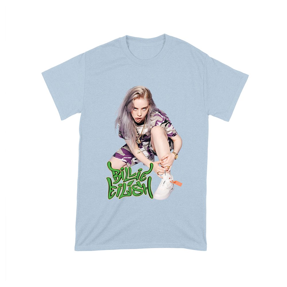 Billie Eilish urban shirt; sitting pose tee; graffiti Billie shirt; green street style t-shirt; pop star fashion; music artist graphic tee; unique Eilish shirt; trendy fan outfit — perfect for birthdays, parties, and celebrations.