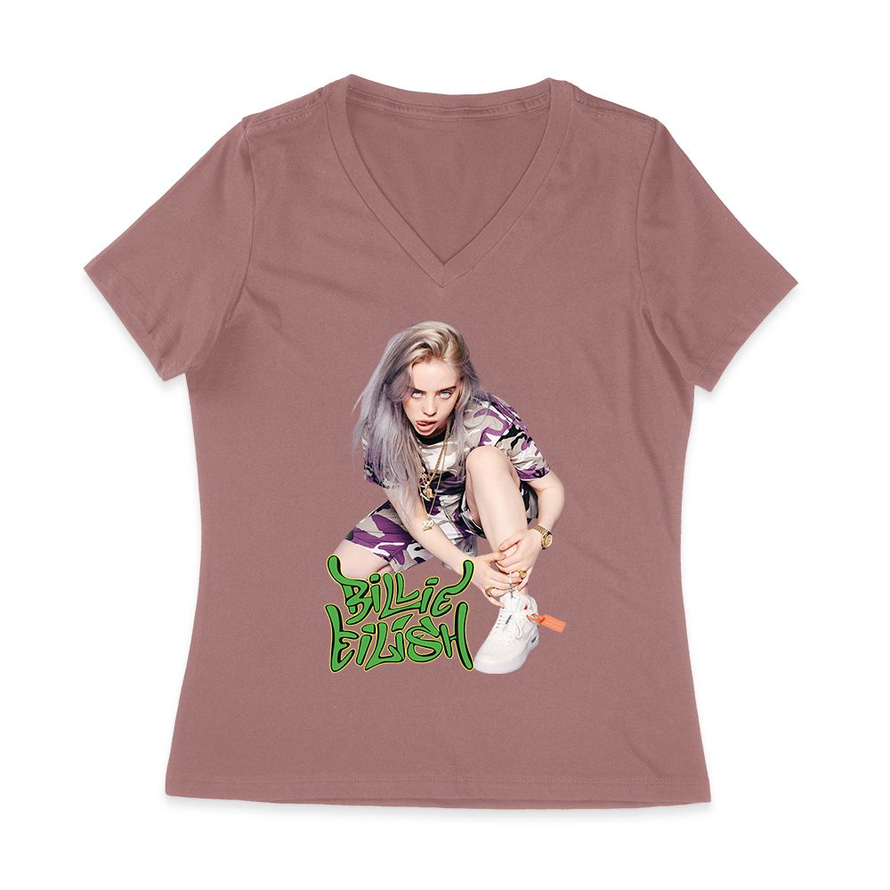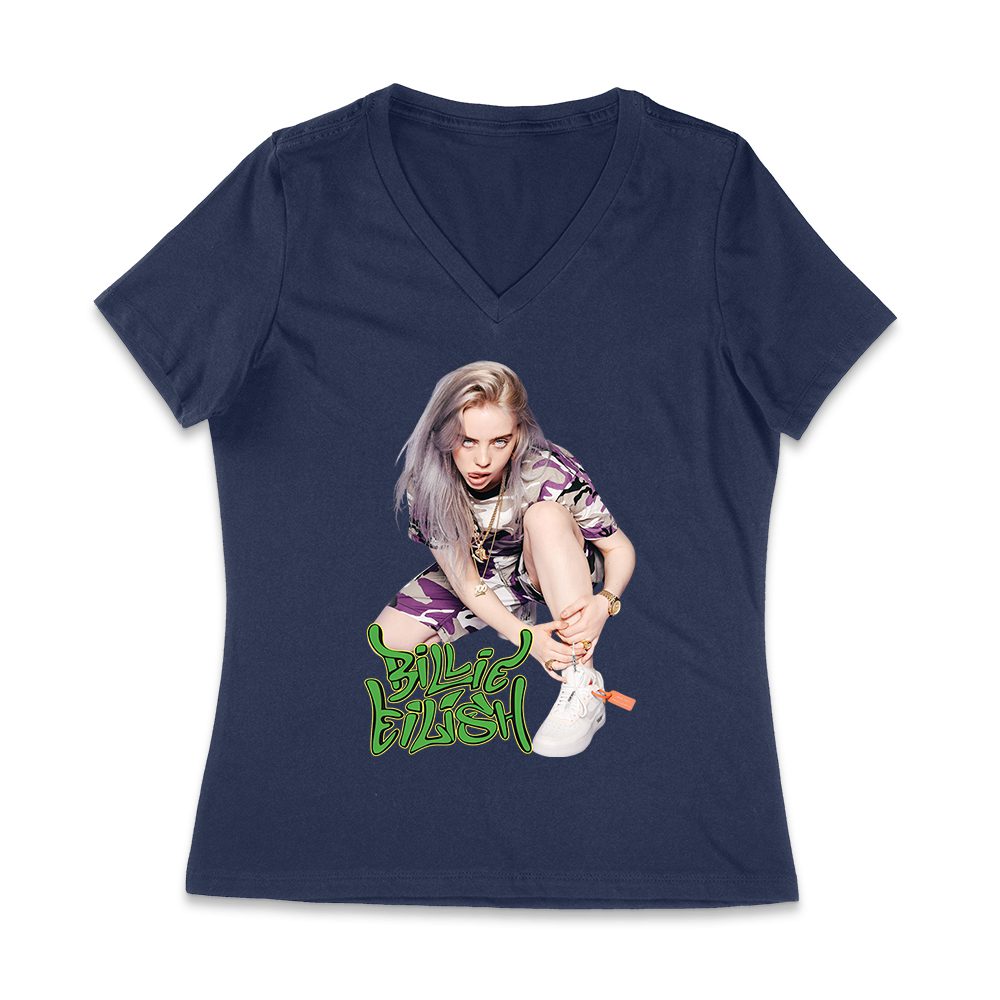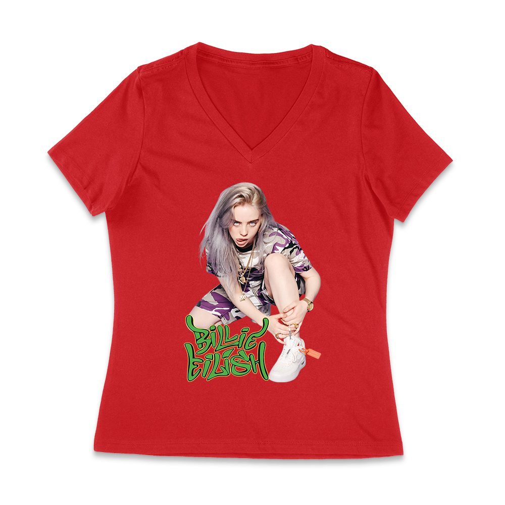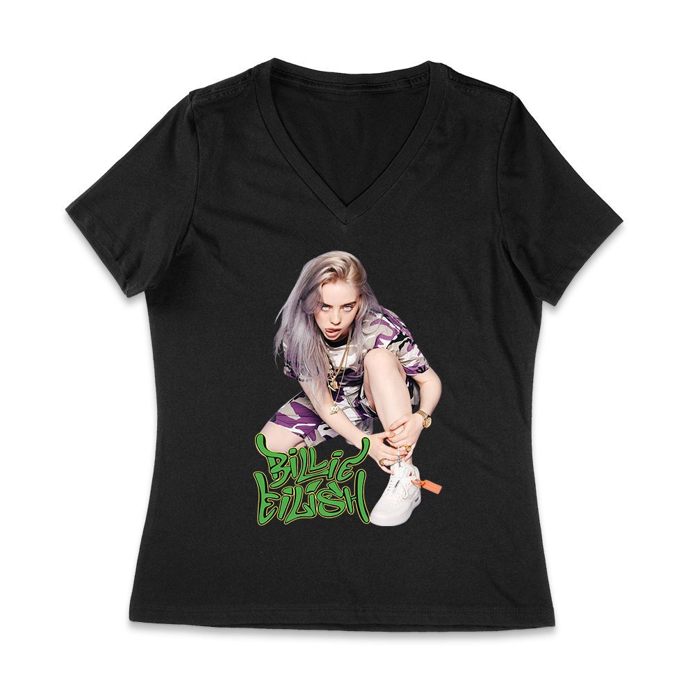 Urban Style Billie Eilish Sitting Pose Green Graffiti T-Shirt Women Jersey V-Neck