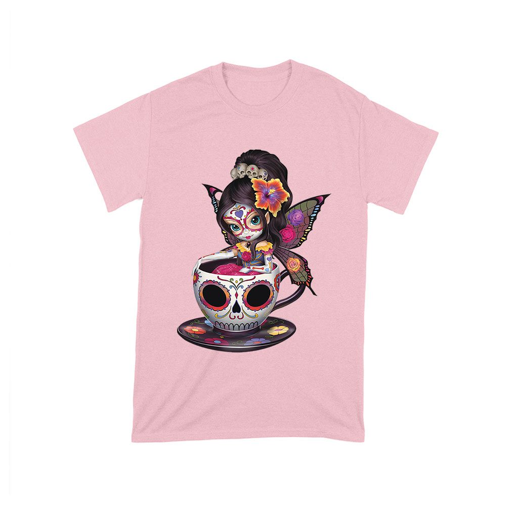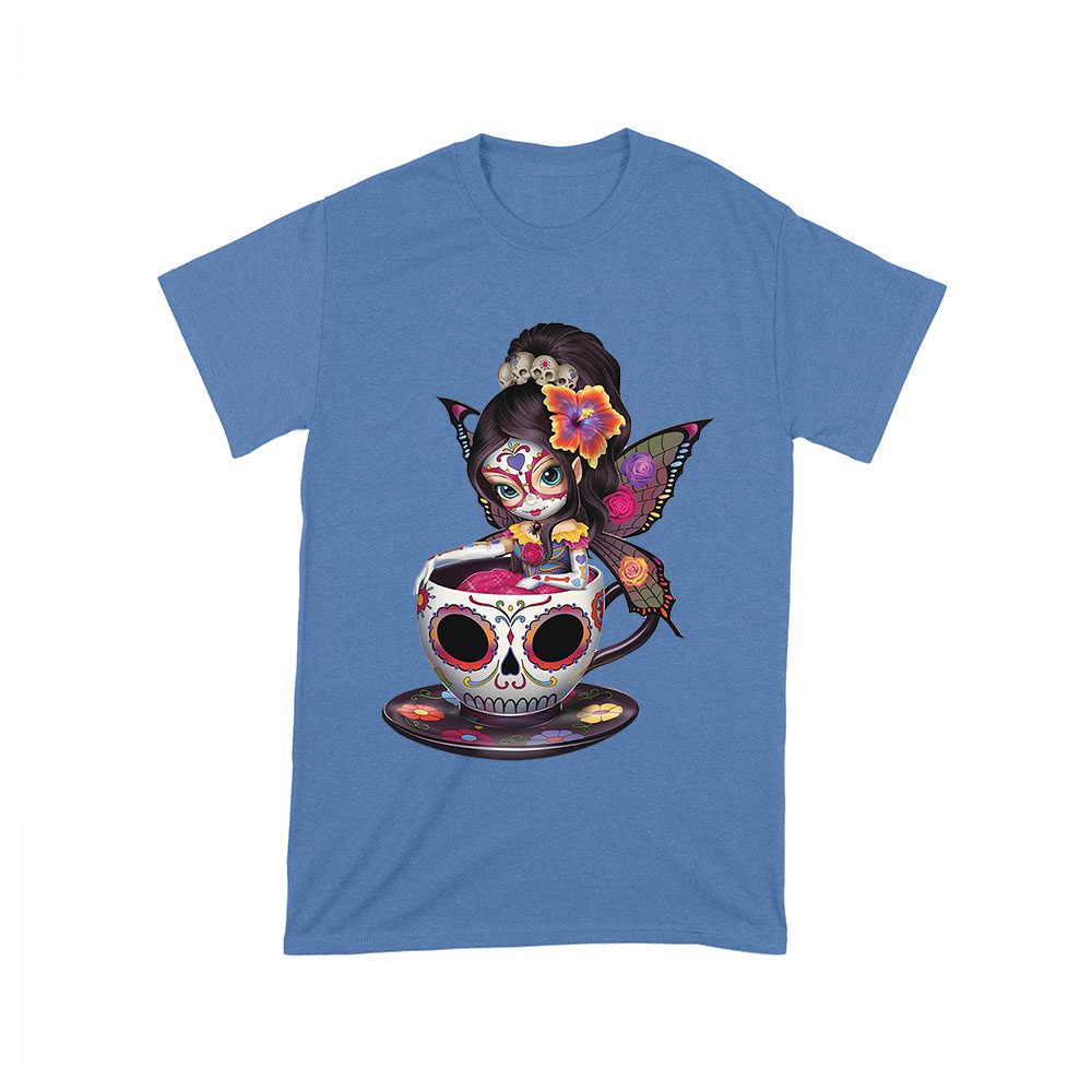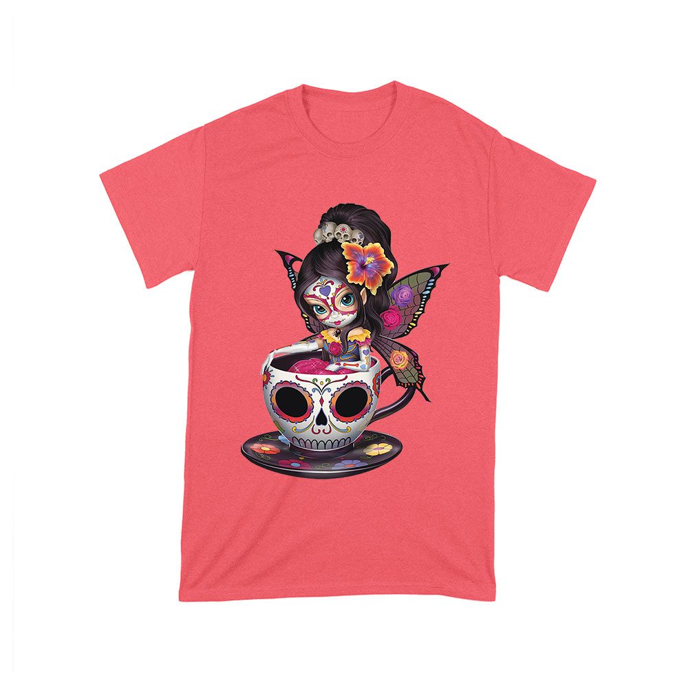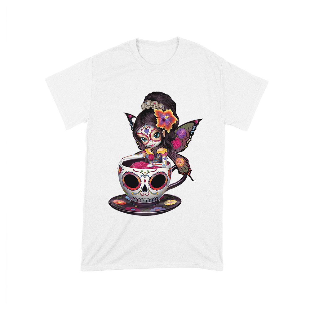 Vibrant Dia de Muertos Fairy T-Shirt with Sugar Skull Art in a Teacup, Perfect for Day of the Dead Celebration
