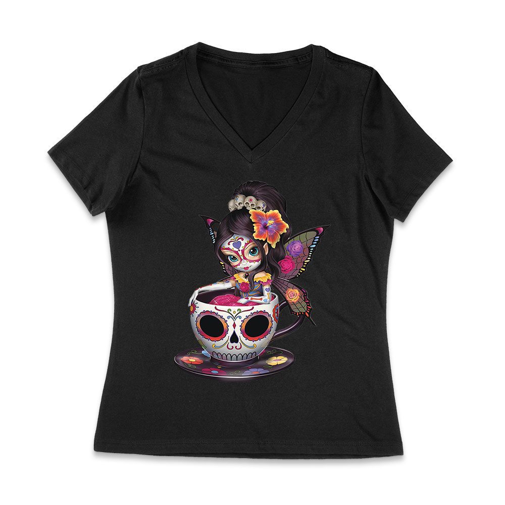 Vibrant Dia de Muertos Fairy T-Shirt with Sugar Skull Art in a Teacup, Perfect for Day of the Dead Celebration Women Jersey V-Neck
